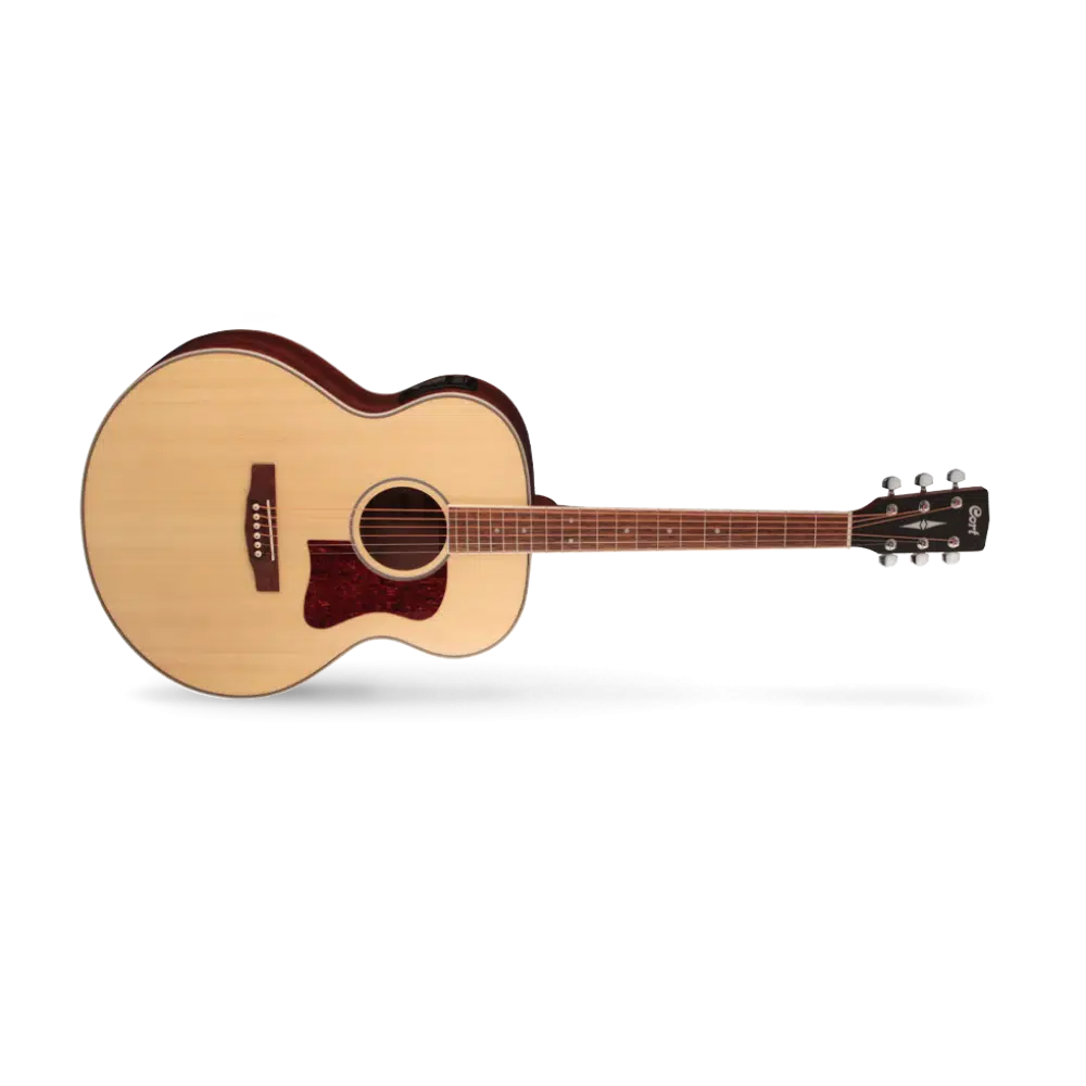 The CJ-MEDX is a jumbo-sized acoustic-electric with a huge sound and the distinguished timeless look that jumbo shaped acoustic guitars are known for. This classic jumbo body guitar features a Spruce top with Mahogany back and sides, and Corts CE306T preamp with 3-band EQ, chromatic tuner, and phase switch for use in a wide variety of playing and performing applications.