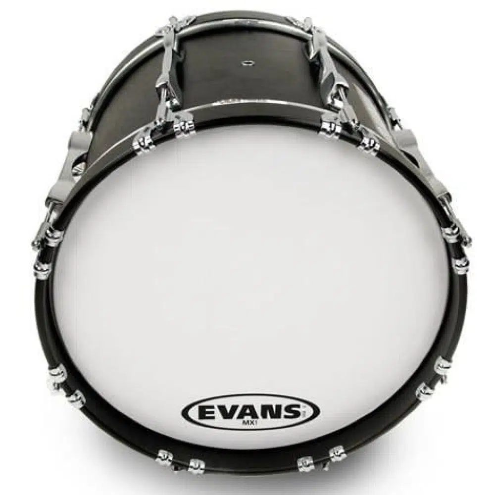 Evans MX Marching Bass 1-Ply series includes a unique tone damping system that can be manipulated by applying individual felt arcs (included) to enhance articulation and focus low-end for both indoor and outdoor marching.