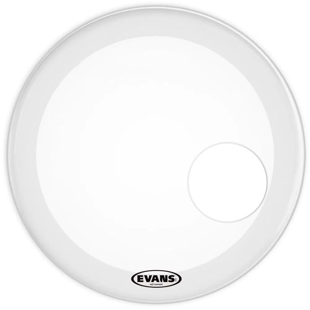 Evans EQ3 Coated White Resonant Bass Drum Heads are made with a single ply of 7.5-mil film equipped with an offset 5" microphone port that allows you to get easy, beautiful sounds in the recording studio. An internal overtone control ring helps eliminate those annoying high overtones.